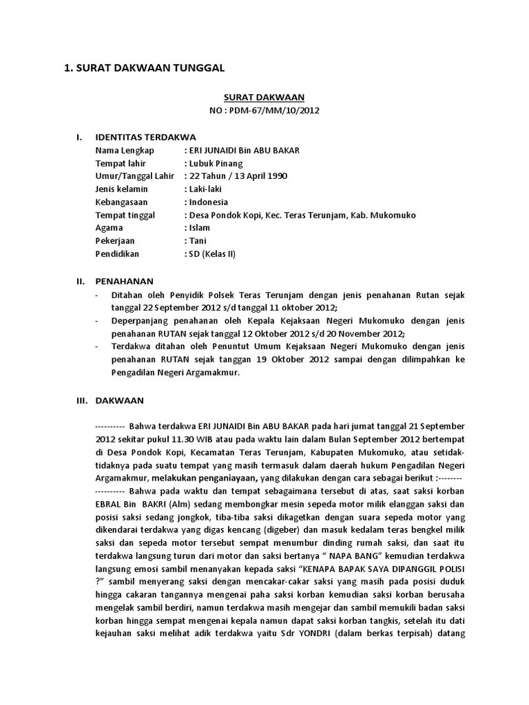 Contoh Surat Dakwaan Lengkap - Doc Contoh Surat Dakwaan Totoh Wildan Tohari Academia Edu / Pencurian, maka dalam surat dakwaan harus dicantumkan semua unsur pasal .